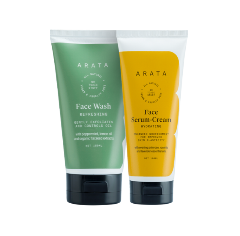 Our 2-step anti-ageing kit offers gentle exfoliation, oil-control, and improved skin elasticity. Our refreshing face wash gently cleanses your skin with non-toxic extracts, while our hydrating face serum-cream is absorbed instantly - moisturising, decreasing inflammation, boosting circulation, and tightening pores with an aromatic mixture of essential fatty acids, vitamins, and plant-based ingredients.