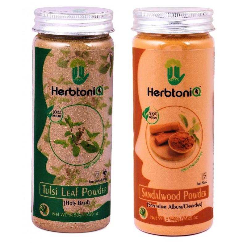 Tulsi Leaf Powder (Holy Basil) Tulsi (Basil) Leaf Powder contains essential oils such as eugenol, citronellol, limonene and terpineol that have effective antiseptic and antibacterial properties. The natural oils of this herb work as a natural cleanser to unclog pores and remove excess oil, dirt and impurities from the skin. The best benefits of basil leaves powder for skin is its potent anti-ageing property that helps in reversing the damage caused by free radicals and maintaining youthful and supple skin that emits a natural glow. Tulsi Leaf Powder works as an effective natural remedy for hair fall and dandruff as well.....Sandalwood Powder (Santalum album/Chandan) Sandalwood Powder has long been used for skin problems and with good reason. Regular use of this antibacterial powder can fight acne-causing bacteria, exfoliate the skin, soothe sunburn, remove suntan, and reduce signs of ageing like dry skin and wrinkles.