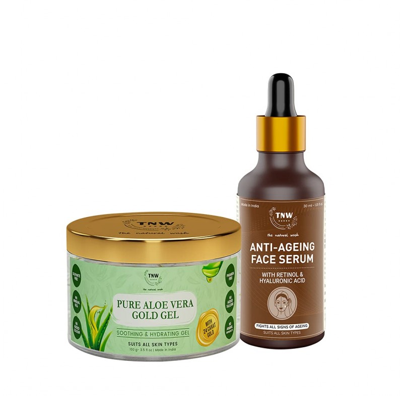 This nourishing combo has all that you need to get a younger looking moisturized skin. Aloe Vera Gold Gel is a nourishing gel that absorbs into the skin in not time and gives complete and thorough hydration to the skin. It has moisturizing, healing and soothing properties that help to relieve irritated skin from sunburns, rashes and redness while rejuvenating the skin. Added Gold particles further help to tighten up the skin and bring a glowing glow. The TNW Anti-Ageing face serum is packed with Hyaluronic, Niacinamide acids and Retinol that help rejuvenating, repairing and revitalizing properties. This natural face serum diminishes all the signs of ageing such as fine lines, wrinkles, enlarged open pores and sagginess without harming the skin’s texture. You can start using this serum in your early 20s for maintaining youthful healthy skin. The duo is all you need to get a radiant glowing, nourishing and younger looking.