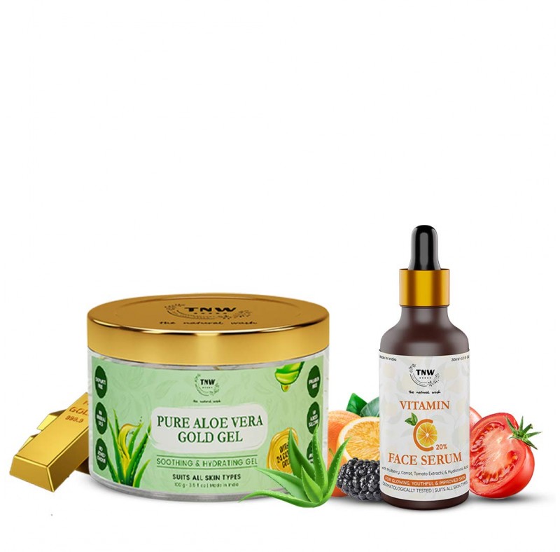 This combo offers the wholesome nourishment to the lips and glowing radiant face as it contains both Pure Aloe Vera Gold Gel and Vitamin C Face Serum. Aloe Vera Gold Gel is a light weight, non-greasy nourishing pure aloe vera gel that absorbs into the skin in no time and gives complete and thorough hydration to the dry areas. It contains pure 90% gel from aloe vera leaves which makes it a highly moisturizing, purifying, healing, and soothing gel. It further helps to relieve irritated skin from sunburns, acne, rashes, and redness while rejuvenating the skin cells and adding radiance to the skin. Exclusively added real 24 carat Gold leaves in it further help to tighten up the skin, minimize open pores and bring a radiant glow. Vitamin C Face Serum is paraben, silicon, and phthalate-free formulation that penetrates deep inside the skin and helps to boost moisture. It is enriched with mulberry extract, tomato extract, carrot extract and other beneficial ingredients to help retain skin's elasticity, maintain moisture and glow of the skin which makes it a beneficial vitamin c serum for glowing skin. Being enriched with Glycolic acid it helps to control excessive oil and acne while keeping the skin smooth and non-greasy. Presence of Hyaluronic Acid boost hydration and helps to prevent signs of ageing, too.